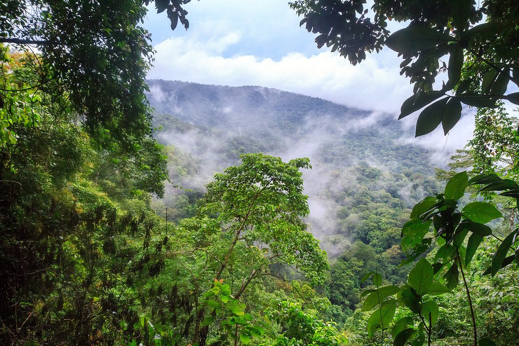 “thickly knotted mangrove swamps and hills and mountains carpeted in dense tropical jungle and astonishingly noisy with baboons and thousands of insects and colourful birds, ….giant white and electric yellow flowers blooming as big as dinner plates on the tops of some of the weirdly primeval-looking trees.” (Sphere Books, 2006)