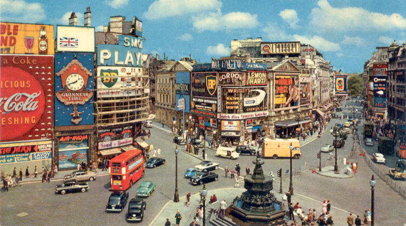 She wasn’t even sure how to get there, so she looked it up in her A-Z and we took a train to Piccadilly Circus. Wow! It was huge! Streets going off in every direction, big neon signs, cars, red double-decker buses, black cabs, theatres, people and more people and even more people!